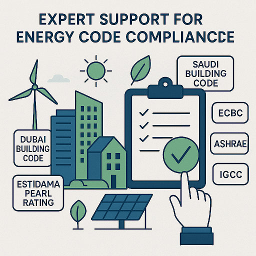 We provide expert support for Energy Code Compliance, ensuring your building design meets mandatory energy efficiency and sustainability standards relevant to your project location and goals. For clients in the Middle East, we align your project with key regional codes such as the Dubai Building Code, Abu Dhabi Estidama Pearl Rating System, and the Saudi Building Code (SBC). For projects in India, we ensure compliance with the Energy Conservation Building Code (ECBC). Additionally, we support adherence to international standards including ASHRAE guidelines and the International Green Construction Code (IGCC), which are often referenced for high-performance and green building certification projects.