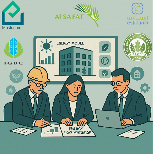 We provide expert assistance in preparing detailed energy documentation tailored to various green building certification programs, including MOSTADAM, Al Safat, Estidama Pearl Rating System, GRIHA, IGBC, and LEED. Our approach begins with a thorough review of the project’s design and energy model to identify all relevant credits and compliance pathways. We systematically collect and verify data, run simulations aligned with certification protocols, and compile clear, well-structured reports that meet specific documentation requirements. Throughout the entire process—from concept and schematic design through to final design and construction stages—we actively engage and collaborate with all stakeholders, including architects, engineers, and certifying authorities. This ongoing interaction ensures accuracy, responsiveness, and alignment with project goals. By combining technical expertise with strong stakeholder coordination, we streamline documentation and boost the likelihood of successful certification while offering valuable insights to enhance building energy performance.