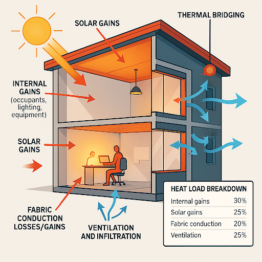 We provide precise and comprehensive Detailed Heat Load Analysis to support optimal HVAC system design and energy efficiency in buildings. Our analysis breaks down the total heat load into key categories, including internal gains (from occupants, lighting, and equipment), solar gains through glazing, fabric conduction losses and gains, ventilation and infiltration loads, and thermal bridging effects. This category-wise breakdown enables clear identification of dominant heat sources and losses, allowing targeted strategies to reduce peak loads and improve comfort.