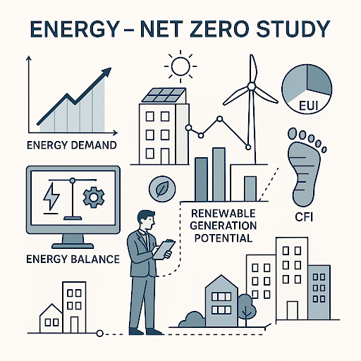 We provide clear analysis of key performance indicators such as Energy Use Intensity (EUI) and Carbon Footprint Index (CFI) to benchmark the building’s trajectory toward net zero. We also assess alignment with recognized frameworks such as Climate Challenge, or local/national net zero policies (as applicable). Our Net Zero Studies help clients make informed decisions about energy systems, electrification strategies, and renewable energy sizing—supporting cost-effective, future-proof, and environmentally responsible design outcomes.