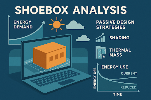 We provide early-stage Shoe Box Analysis to support sustainable design decisions before architectural detailing begins. This simplified energy modelling technique uses basic geometric forms to evaluate the fundamental impact of building orientation, shape, and envelope characteristics on overall energy demand. We provide actionable insights into passive design strategies—such as optimal massing, glazing ratios, natural ventilation, shading, and thermal mass—that reduce energy loads from the outset. We provide quick yet reliable simulations that help clients and design teams explore multiple design options with speed and confidence. By embedding performance thinking at the pre-concept stage, we help reduce operational energy use, lower carbon emissions, and lay the groundwork for compliance with future sustainability targets and green certifications.